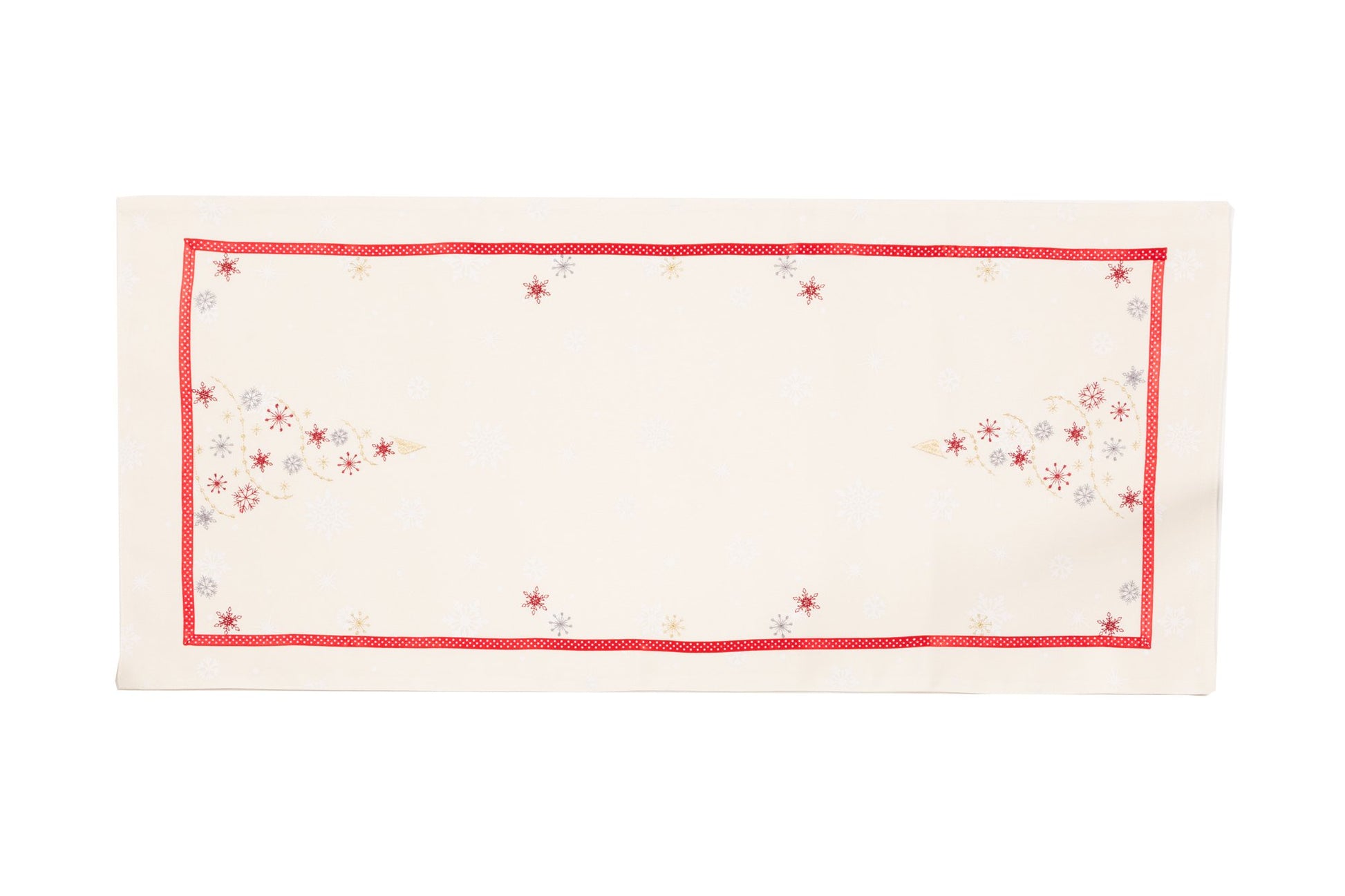 - Crystal snowflakes embroidered on premium quality Christmas winter white fabric. Double layers.